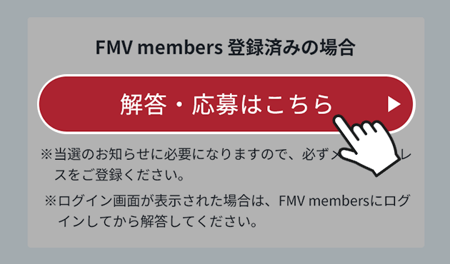 ※日付の切り替えはAM0:00 ※キャッシュバックがもらえるのは1日1回です。 ※キャッシュバックの受け取りには、FMV membersへの登録およびログインが必要です。 ※キャッシュバックはふくまろアイコンをクリックするとその場で付与されます。 ※応募当日のクイズへの解答からのみが有効となり、過去の問題からは応募いただけません。 |