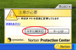 - 以上の設定がおわりましたら、「Norton Protection Center」の[今すぐに解決(F)]をクリックしてください。