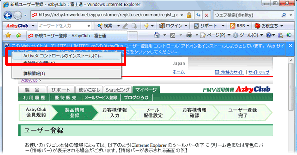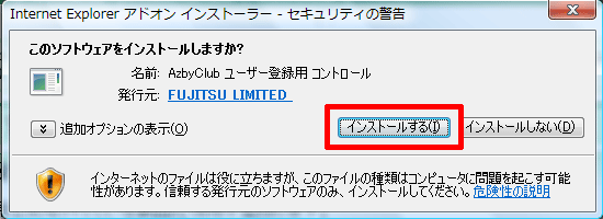 お使いのパソコンがWindows Vistaの場合の「AzbyClubユーザー登録用コントロール」のインストール方法をご説明いたします。