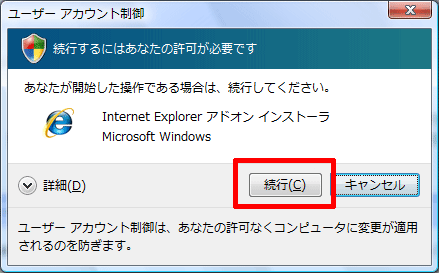 「ユーザーアカウント制御」の画面が表示されるので、「続行(C)」をクリックします。【画面例-3】の赤線で囲まれた部分です。