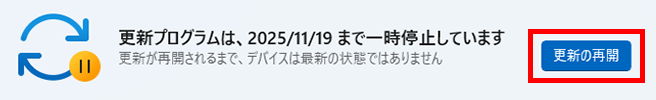 - Windows Updateの「更新の一時停止」を設定している場合は、解除します。
