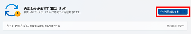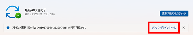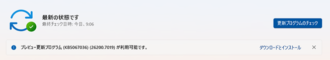 - 「プレビュー更新プログラム(KB5067036)(26200.7019)が利用可能です。」が表示されます。