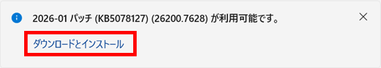 「2026-01 パッチ(KB5078127)(26200.7628)」が表示された場合は、「タウンロードとインストール」をクリックします。