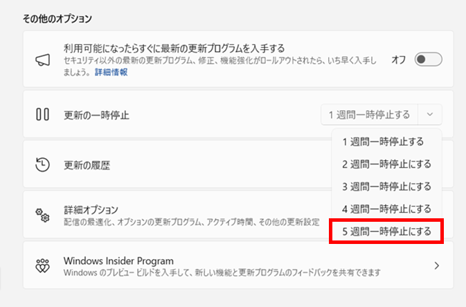 - 「更新の一時停止」を「5週間一時停止にする」にします。