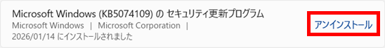 」の順にクリックします。 - 「Microsoft Windows(KB5074109)のセキュリティ更新プログラム」の「アンインストール」をクリックします。